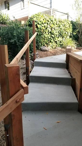 It was a very wet winter in 2016-2017 which caused a huge oak tree to fall and damage my client’s stairway from the house to the lower part of their property that connects to the creek. After the complete clean-up of the site, we were able to begin by rebuilding the retaining wall that was not built correctly. We used all redwood instead of pressure treated, per client’s request. During the building process, we formed the staircase and installed our rebar. During reconstruction, we ran a new water and electrical line to the lower level of the property. We re-worked all of the electrical and installed low-voltage lighting. The handrail was designed by the client to be simple and sleek.